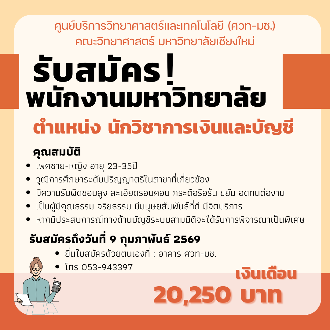 ประกาศรับสมัครพนักงานประจำศูนย์บริการวิทยาศาสตร์และเทคโนโลยี ตำแหน่ง นักวิชาการเงินและบัญชีจำนวน 1 อัตรา
